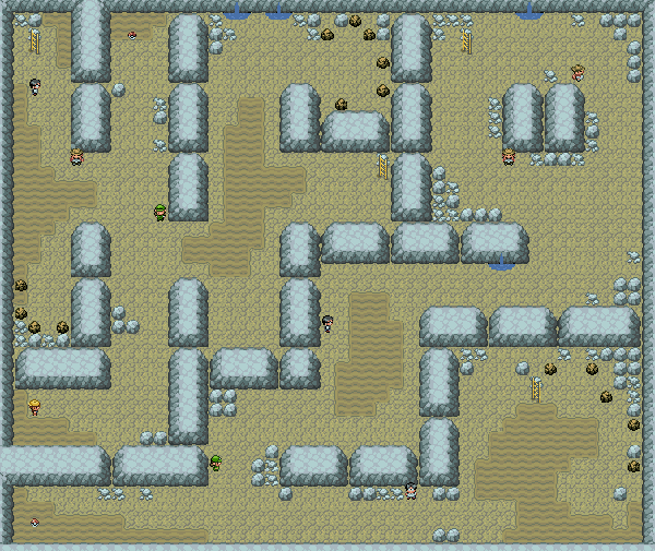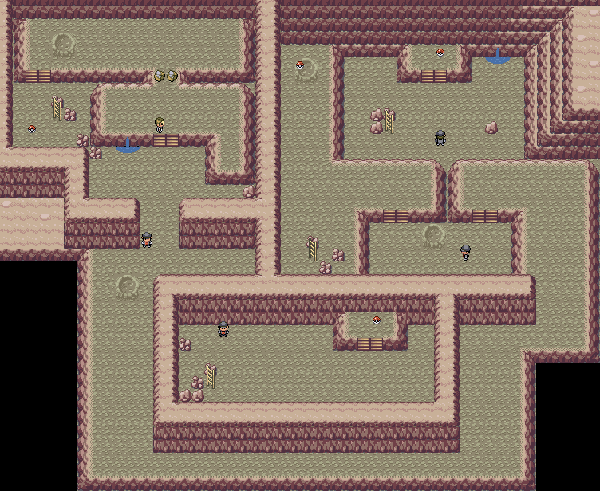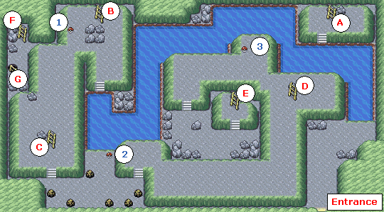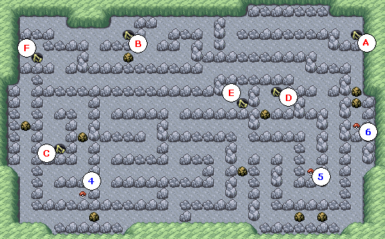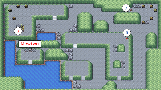 Explore bem a caverna, cuidado para n�o se enrolar nos labirintos. As letras indicam onde as escadas v�o dar. Use Rock Smash para chegar at� alguns itens, um deles � a Ultra ball, j� � uma ajuda para tentar capturar o Mewtwo.