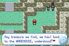 Antes de mais nada, vamos acabar de vez com esse assunto dos Rockets. Siga caminho � direita do Pok�mon Center, haver� Rockets pelo caminho, siga em dire��o ao sul. Logo achar� um casar�o bem grande, aqui � o Rocket Warehouse. Se voc� passou por ambos os lugares onde estavam o Ruby e a Sapphire, voc� consiguir� entrar. Abaixo segue um mapa do lugar, siga as setas vermelhas primeiro, depois as azuis: