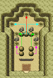 Tanoby Ruins s�o as ru�nas onde se encontram os Unowns, para chegar at� l�, basta seguir caminho ao sul da ilha. Traga pok�bolas se quiser ir capturando os Unowns. Traga pok�mons com Surf e Strenght. Encontrar� treinadores pelo caminho, em um certo ponto, ver� uma caverna. Entre nela e empurre as pedras, abaixo est� o mapa, siga a dire��o da seta vermelha primeiro, depois azul, depois roxa e depois verde:
