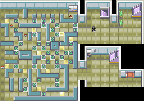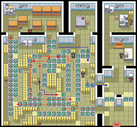 No andar de baixo voc� ver� outro labirinto desses abaixo. Pise nas setas e ser� levado na dire��o em que elas apontam. Quando encontrar um Rocket no final do labirinto, v� para a direita para encontrar um item e outra escada para descer. Des�a-a e v� at� o lugar mais acima do andar. Voc� ver� um Rocket. Lute com ele e depois que vencer fale novamente com ele para ganhar o Lift Key.